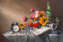 Drawing inspiration from Harmen van Steenwyck’s "Allegory of the Vanities of Human Life", I created a vibrant still life teeming with art historical symbols and cherished childhood mementos. An homage to tangible treasures, it doubles as a contemplation on nostalgia's captivating pull. True to the vanitas genre, it intertwines reminders of time's passage, manifested in the ever-present "memento mori". This serves as a gentle nudge, urging us to avoid excessive attachment to material possessions.