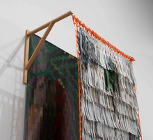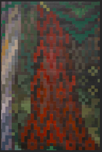 "Into the Woods: Scorned as Timber, Red Cedar, Wood Interior (Emily Carr)" is a large-scale mixed-media art installation that spans 4 feet wide and 8 feet tall. From a distance, the viewers are greeted with a towering and heavily textured hanging sculptural tapestry on an orange safety fence. The front piece reveals a pixelated image of Carr's painting printed on a vinyl banner, displaying a deforested landscape. A tunnel behind leads to another background mural of collaged paintings, contrasting the first piece with a lush, thriving, and flourishing forest. By pixelating, shredding, weaving, and reconstructing the landscape paintings by Carr, I aim to create a new terrain where viewers can make their own enriched journey of exploring a coastal rainforest. And also grow awareness of present environmental, social, and cultural awareness.
